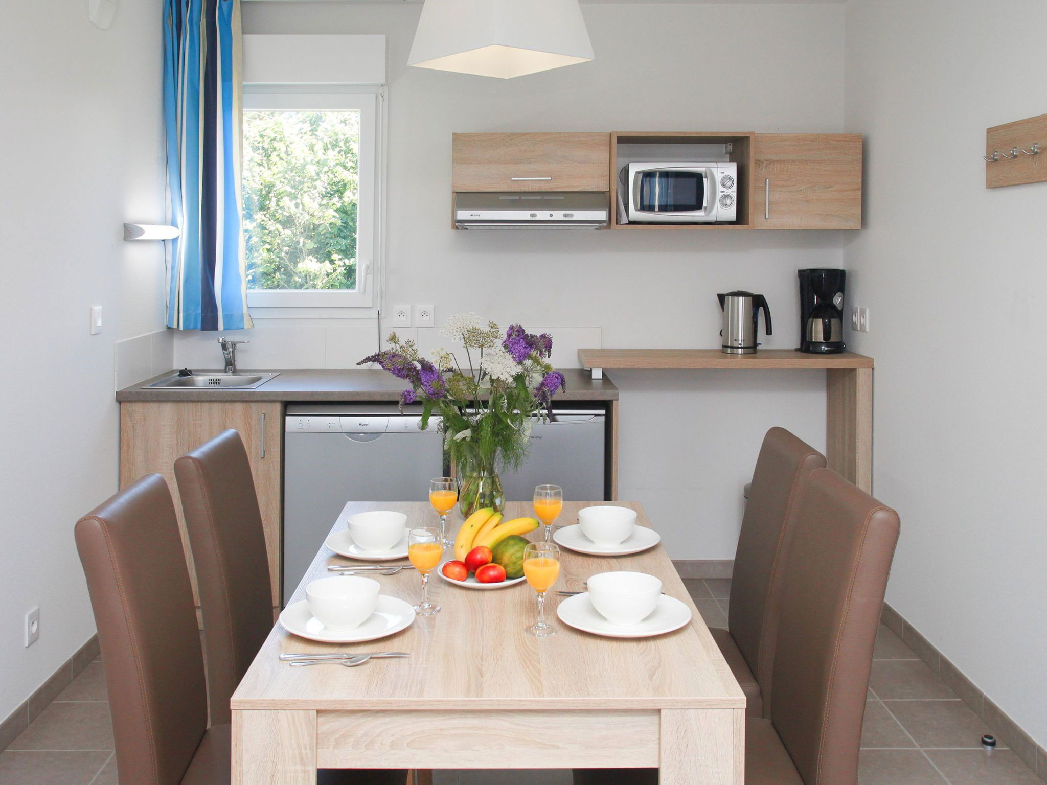 "Odalys Référence Les Iles du Morbihan", Appartement de 3 pièces 49 m2. Aménagement agréable: séjour/chambre à coucher avec 2 couchages (90 cm, longueur 190 cm), table pour les repas et TV (écran plat). Sortie sur le jardin, sur le balcon. 1 chambre avec 1 grand-lit (160 cm, longueur 200 cm). 1 chambre avec 2 lits (90 cm, longueur 190 cm). Petite coin cuisine (lave-vaisselle, 2 plaques vitrocéramiques, bouilloire électrique, cafetière électrique, combiné micro-ondes). Bains/WC ou douche/WC. Chauffage électrique. Petit balcon ou petite terrasse. Meubles de terrasse. A disposition: chaise haute pour enfant, lit bébé (en sus). Internet (Connexion WIFI, gratuit). Veuillez noter: logement non-fumeur. Maximum 1 animal/ chien autorisé. Détecteur de fumée, extincteur.